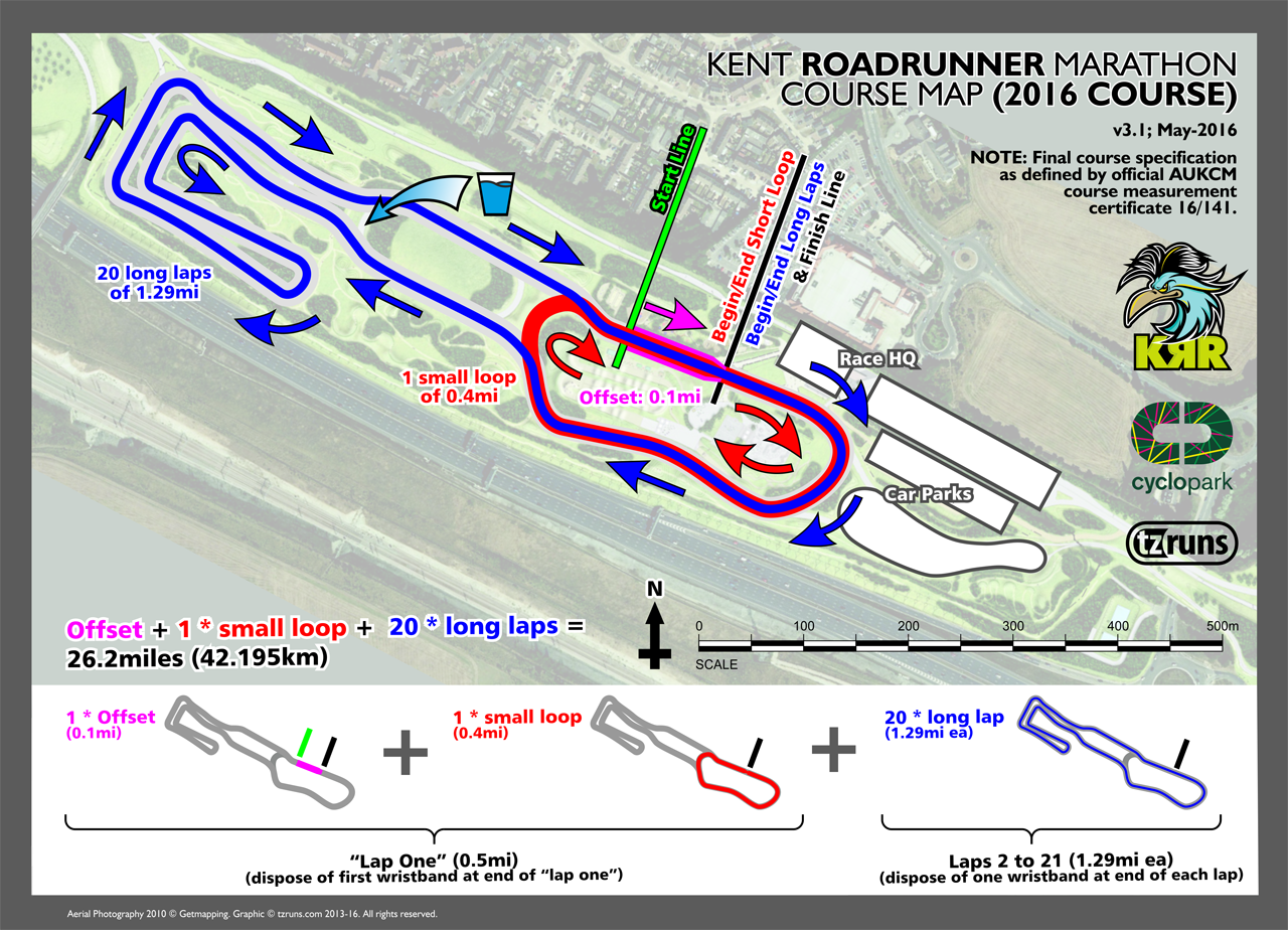 The 2012-2015 Kent Roadrunner Marathon carried UKACM course measurement certificate 12/178 validating that the course was an accurate 42.195km (26m 385y). The 2012-2015 marathons used a 1.55 mile lap.