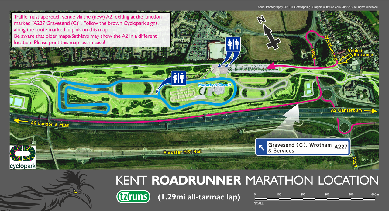 The 2016 Kent Roadrunner Marathon uses a 1.29 mile lapped circuit. Our marathon runners will have exclusive use of the entire tarmac track for the day, with access to the onsite showers, toilets, changing rooms, café, etc.